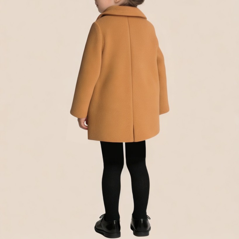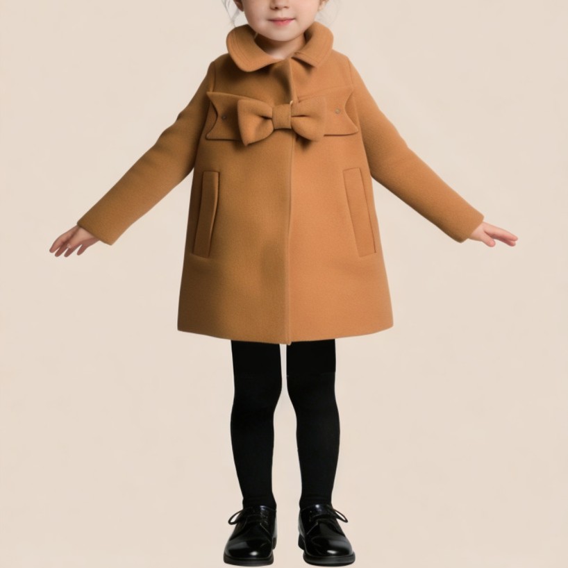This girls' coat cleverly combines a classic lapel design with sweet details, showcasing a warm and adorable autumn/winter style. The simple and elegant lapel design enhances the overall neat and stylish look. The button closure makes it easy to put on and take off, while maintaining a clean and polished front. Bow embellishments add a playful and feminine touch. The two side pockets are both practical and aesthetically pleasing, allowing children to easily store their small belongings. The loose fit provides comfort and freedom of movement, making it suitable for everyday outings, school life, or holiday wear – a versatile and practical addition to any autumn/winter wardrobe.
