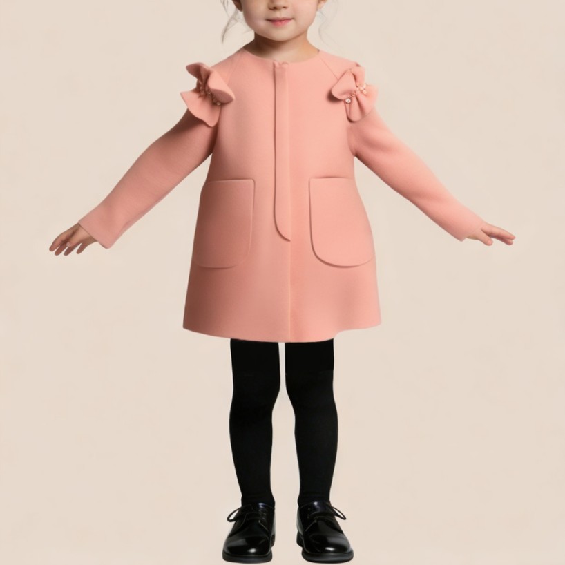 This girls' coat features a gentle and delicate design style, combining both beauty and practicality, making it an ideal garment for the autumn and winter seasons. The round neckline is simple and elegant, fitting comfortably around the neck without restriction. The neckline and overall design incorporate ruffle detailing, adding a sweet and layered touch to the look and showcasing the girl's elegant temperament. The button closure design is convenient for putting on and taking off, while also enhancing the overall sophistication and stability of the garment. The two side pockets are both practical and decorative, perfect for storing small items. The overall fit is comfortable and provides excellent warmth, suitable for everyday wear, school, or special occasions, keeping your child warm and comfortable during the cold season.
