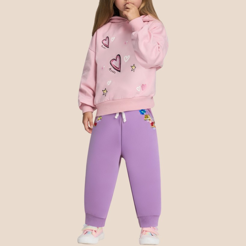 These girls' trousers are adorned with fresh floral embroidery, adding a sweet and playful touch that makes the overall look more vibrant and adorable, easily creating a stylish everyday outfit. The elastic waistband combined with a drawstring allows for adjustable fit, ensuring a secure and comfortable wear, and making it easy for children to put on and take off independently. The two side pockets are practical and stylish, meeting everyday storage needs. The elasticated cuffs fit snugly around the legs, preventing slippage and allowing for greater freedom of movement. The overall design is comfortable and suitable for everyday outings, playtime, or casual occasions.