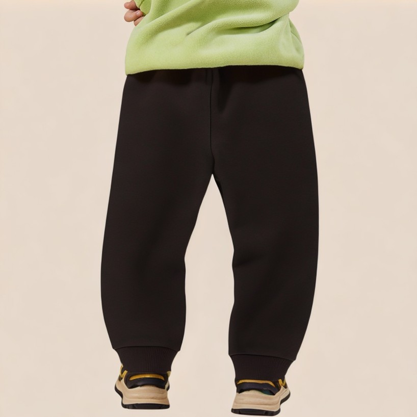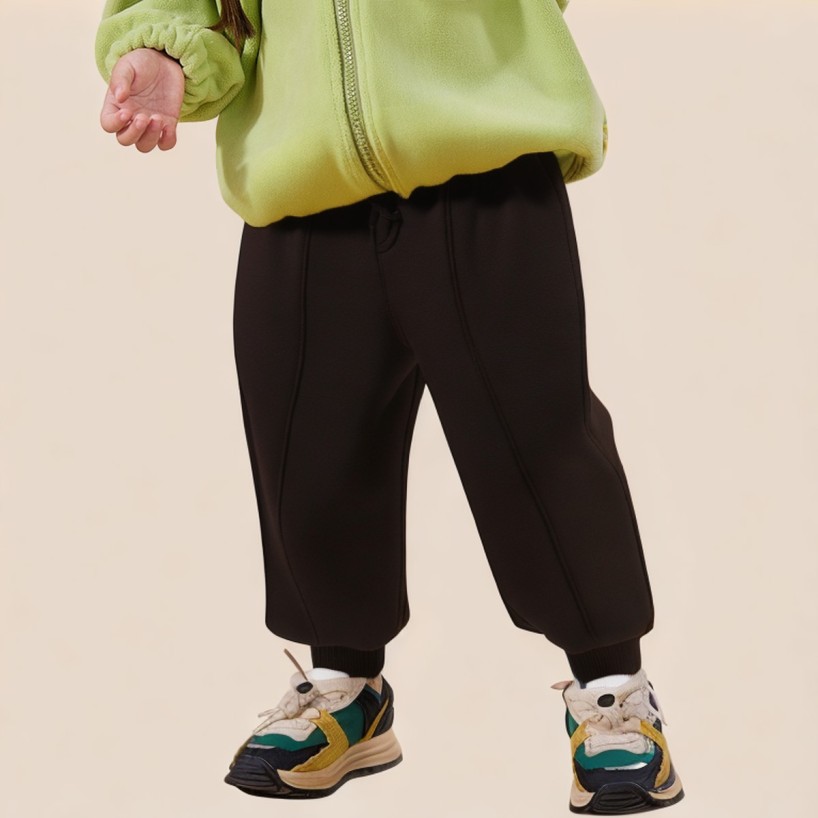 These boys' trousers strike a balance between detail and comfort, combining practicality and style, making them suitable for everyday wear, casual outings, or light sports activities. The trousers feature refined seam details, enhancing the overall look and adding a touch of sophistication to the simple design. The elastic waistband with a drawstring allows for adjustable fit, ensuring a secure and comfortable feel. The elasticated cuffs create a neat silhouette, allowing children to run and jump freely without the trousers slipping down or dragging on the ground. The fabric is soft and comfortable against the skin, ensuring comfort even with prolonged wear.