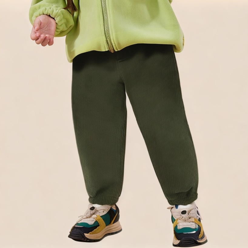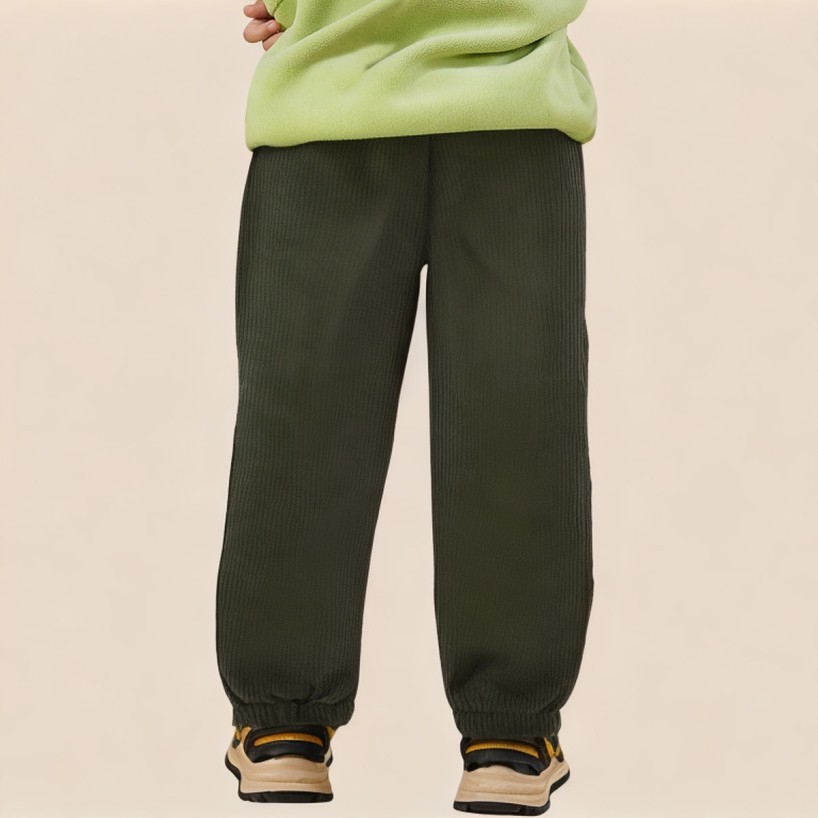 These boys' trousers feature a simple, versatile design that easily pairs with various tops. The elastic waistband with contrasting drawstring makes them easy to put on and take off, while adding a lively detail. The waist is adjustable for a comfortable, non-restrictive fit. Practical side pockets provide convenient storage for small items. The elasticated cuffs create a neat silhouette and allow for freedom of movement. The overall fabric is soft and comfortable, durable and easy to care for, making them suitable for everyday wear and outdoor activities.