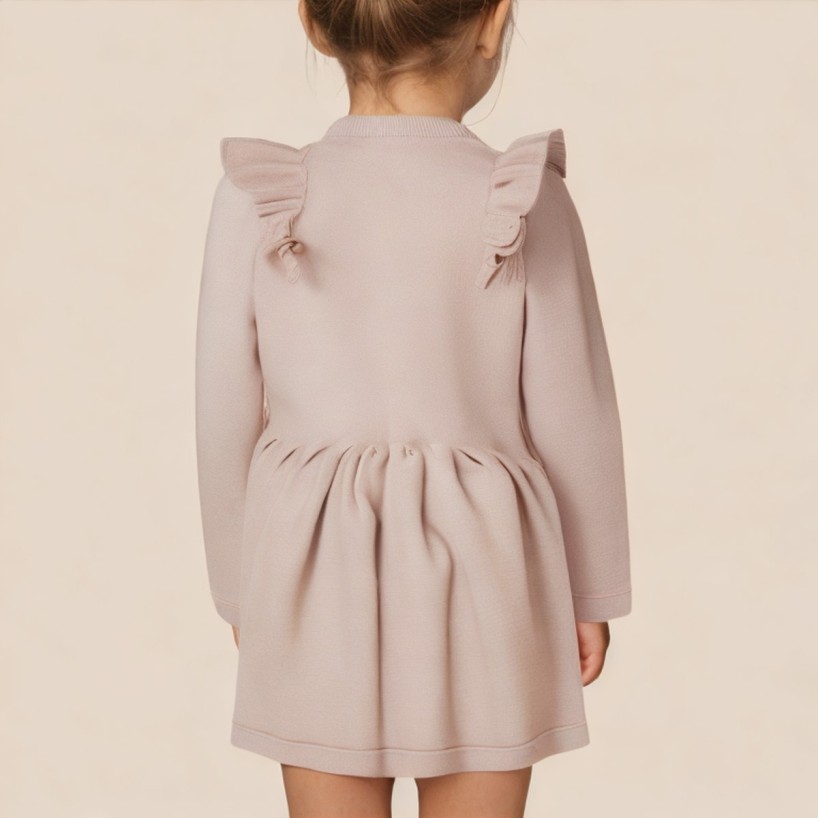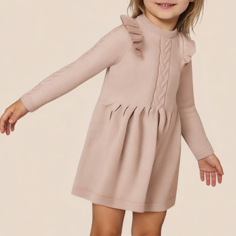This girls' dress features a simple and soft design, creating a comfortable yet playful everyday outfit. Made from delicate knit fabric, it's soft to the touch and comfortable to wear, perfect for children's daily activities and extended wear. The classic round neckline and long sleeves offer clean lines, making it easy to style and suitable for multiple seasons. The solid color knit style presents a natural and gentle visual effect, understated and versatile.  Exquisite ruffle details are added to the skirt, adding a touch of liveliness and sweetness to the overall look. The subtly pleated hem moves naturally when walking, giving the dress a more layered and three-dimensional appearance, making it easy to wear for both everyday outings and casual occasions.