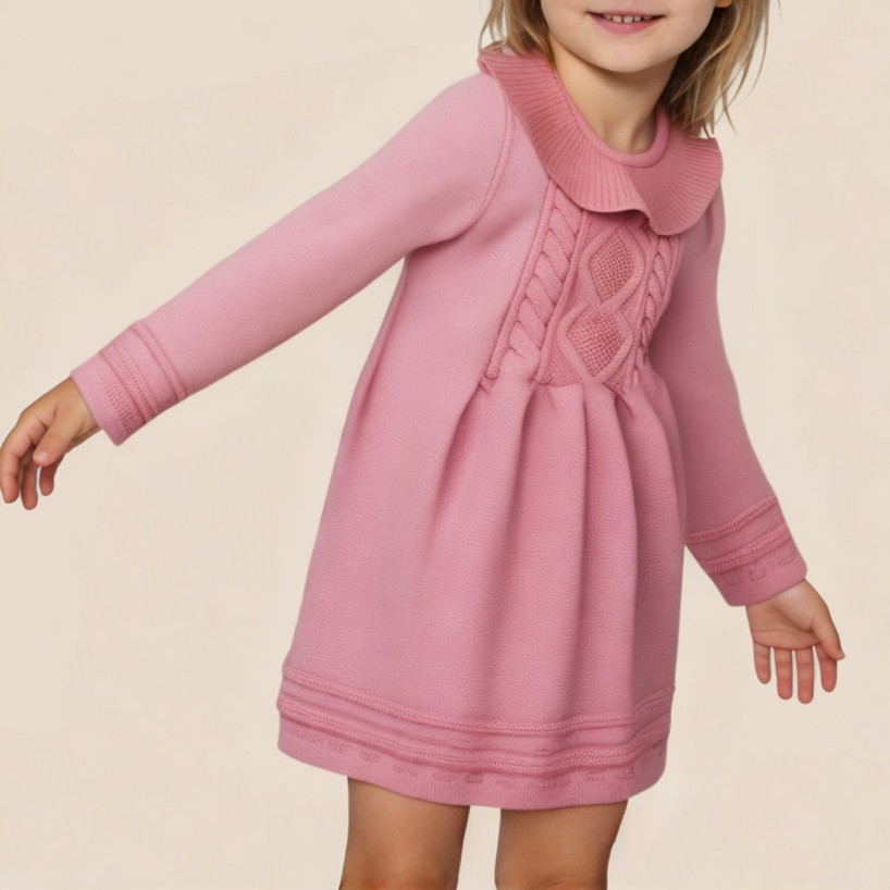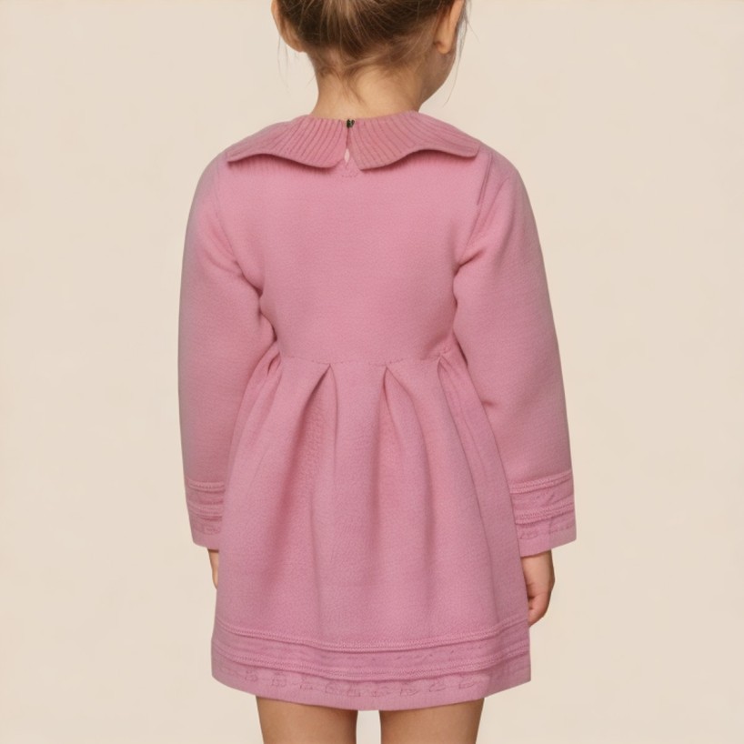 This girls' dress features a stylish knitted pattern, showcasing a lively and adorable childlike style. The soft and comfortable acrylic fabric is lightweight and warm, suitable for everyday wear and various casual occasions. The classic round neckline and long sleeves make it easy to put on and take off, balancing practicality and comfort. Ruffle details on the skirt add a playful touch and layered look, while the wide hem allows the dress to drape naturally, creating a light and flowing silhouette. The back button closure makes it easy to wear while maintaining a clean and elegant overall look. Whether for everyday outings, school wear, or casual gatherings, this dress is versatile and a must-have in any wardrobe.