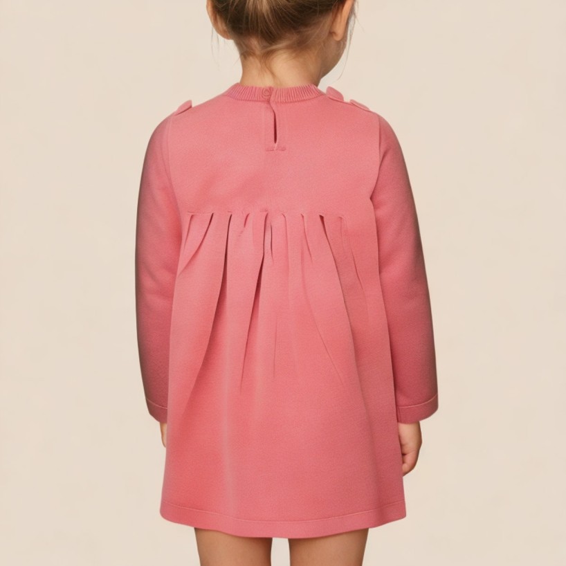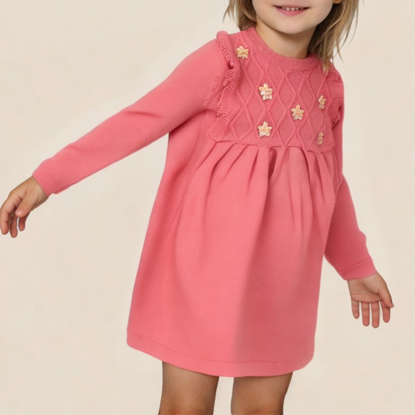 This girls' dress features delicate embroidered flowers and knitted patterns, showcasing an elegant yet playful childlike style. The soft and comfortable blended fabric has a delicate feel, suitable for children's daily wear and various leisure activities. The ribbed round neckline and long sleeves make it easy to put on and take off, while ensuring both comfort and practicality. The skirt is adorned with ruffle details, adding a lively layered look, and subtly swaying to reveal a playful and adorable charm. The back button closure makes it easy to wear and maintains a neat and beautiful overall look. Whether for everyday wear, home activities, or outings, this dress is easy to style and a versatile addition to any wardrobe.
