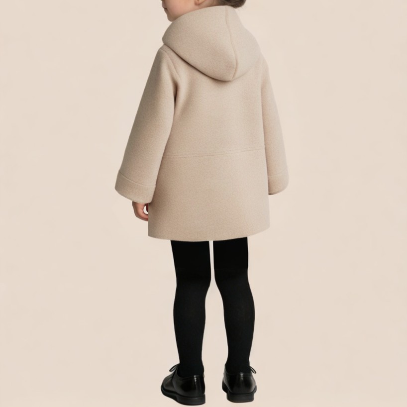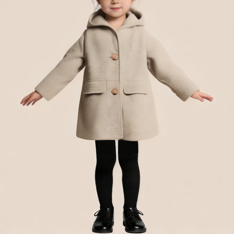 This girls' coat features a felted texture as its design highlight, presenting a simple yet stylish look for autumn and winter. The hooded design adds warmth and cuteness, while also adding a layered effect to the overall outfit. The single-breasted design is simple and neat, making it easy to put on and take off, while maintaining a clean and beautiful silhouette. The two flap pockets on the sides are not only practical but also add a touch of detail to the coat. The loose fit ensures comfort and freedom of movement, allowing children to move freely during their daily activities. Whether for school, everyday wear, or weekend outings, this coat is a versatile and practical outerwear piece for any wardrobe.