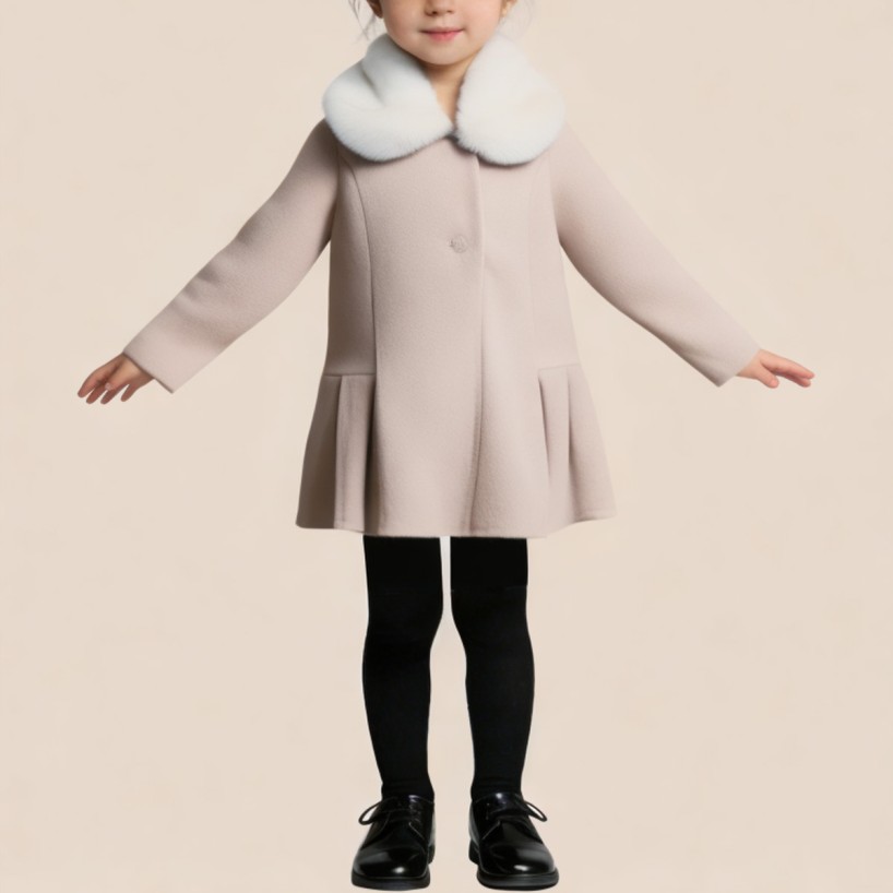 This girls' coat features a plush collar as its design highlight, creating a warm and sweet overall style that is both fashionable and practical. The long sleeves fit the arm's contours, providing warmth and wind protection, making it suitable for everyday wear and outdoor activities in autumn and winter. The single-breasted design is simple and neat, easy to put on and take off, while maintaining a clean and elegant front appearance. The pleated hem adds layers and a sense of movement, making the overall look more playful and cute. Whether for everyday outings, school wear, or holiday gatherings, this coat is a warm and versatile essential for any wardrobe.